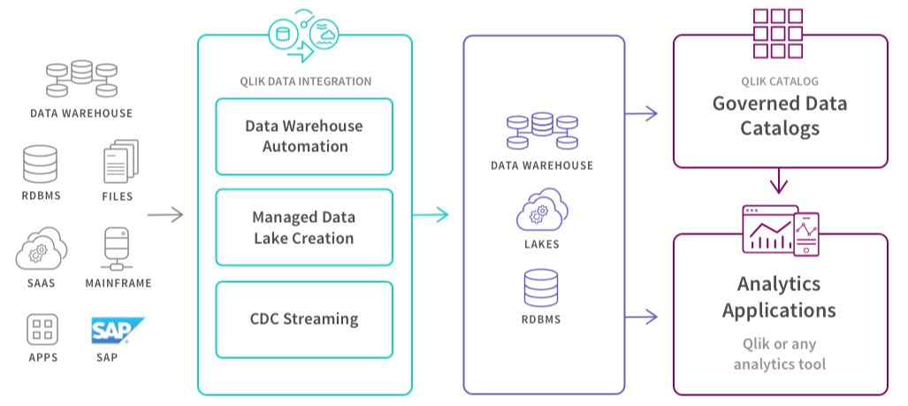 Qlik Data Integration permite la circulación de datos en tiempo real mediante entornos multifacéticos en la nube y data lakes, llevando información en tiempo real a través de toda una compañía mientras se integra con análisis predictivos e inteligencia artificial.